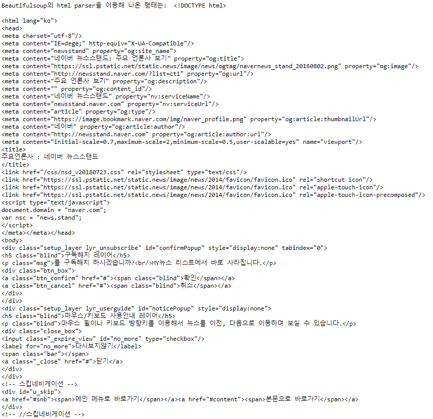 print('Beautifulsoup의 html parser을 이용해 나온 형태는: ', soup)