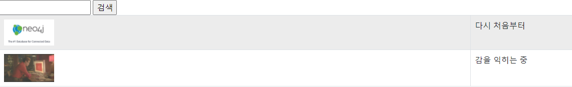 아래처럼 "감을" 이라고 검색하면 content 속성 안에 해당 단어가 있는 데이터를 보여주고, form에는 value="{{ q }}" 라고 지정했기 때문에 텍스트 창에 그대로 값이 남아있게 됩니다.